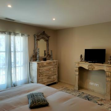 Elle occupe l’aile gauche du mas dans la bâtisse initiale de plus de 150 ans. Vous aurez la vue sur la piscine, avec en plus, les dernières lueurs du soleil couchant qui viendront baigner la chambre. Un lit king size de 180 X 200 et une télé à écran plat viennent compléter le confort de cette superbe chambre. Chambre climatisée et luxueuse.